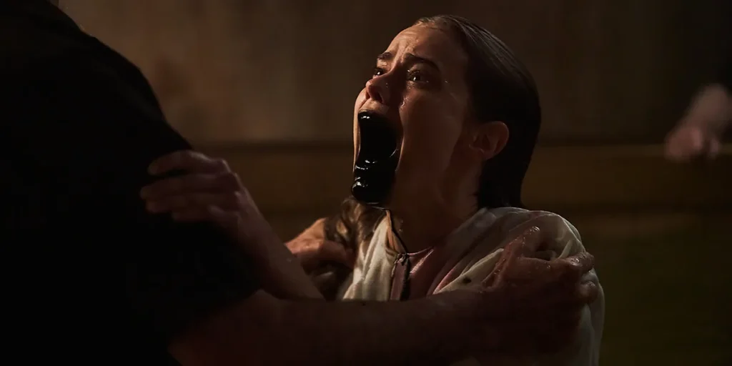 The “baptism for the dead” is a real FLDS practice, a ritual meant to grant salvation to the deceased by proxy, and the film mines that foundation for maximum dread. The sequence where something is extracted from Elise is skin-crawling in the best way: a tangled, hairball-like mass slowly regurgitated and yanked free while she convulses and gasps. It’s visceral, it’s uncomfortable, and it’s precisely the kind of image that refuses to leave your head after the credits roll. Phillips wisely holds back on the big supernatural showpieces until the final stretch, letting tension build through suggestion and shadow. When the horror finally erupts in the last fifteen minutes, it earns every bit of its impact.