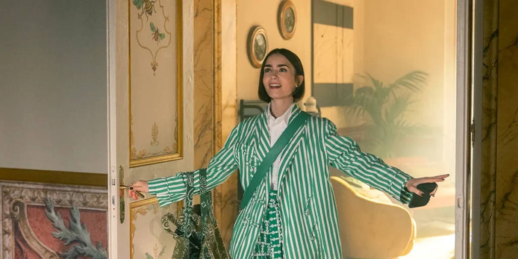 Emily returns with a haircut staking its claim in the cinematic bob hall of fame. She’s now running the Rome office of marketing firm Agence Grateau and continuing her relationship with Italian businessman Marcello (Eugenio Franceschini). Emily is wearing the big-girl pants—likely tagged YSL—embracing her new role and location, and shedding the things that once bound her to Paris, including her on-again, off-again romance with the hot chef next door, Gabriel (Lucas Bravo).