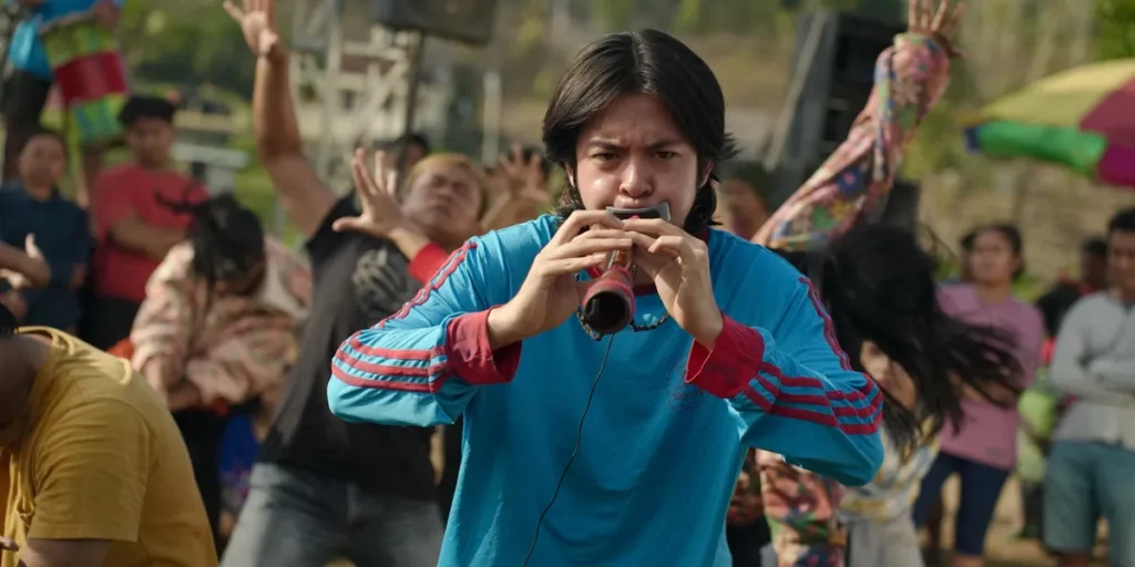 The film takes place in a town where people let themselves be possessed by animal spirits for psychedelic fun. Many aspire to take up the professional life of a spirit channeler, including village-dwelling amateur Bayu (Angga Yunanda), whose father (Indra Birowo) insists on dragging him away from his home to work for him. His chance comes when a competition, led by Guru Asri (Anggun), is held to determine who will take part in a series of trance party fundraisers to stop an impending eviction. If you can’t unconditionally accept any of this, or the imagery of people growling and crawling around like various animals en masse, then leave now.