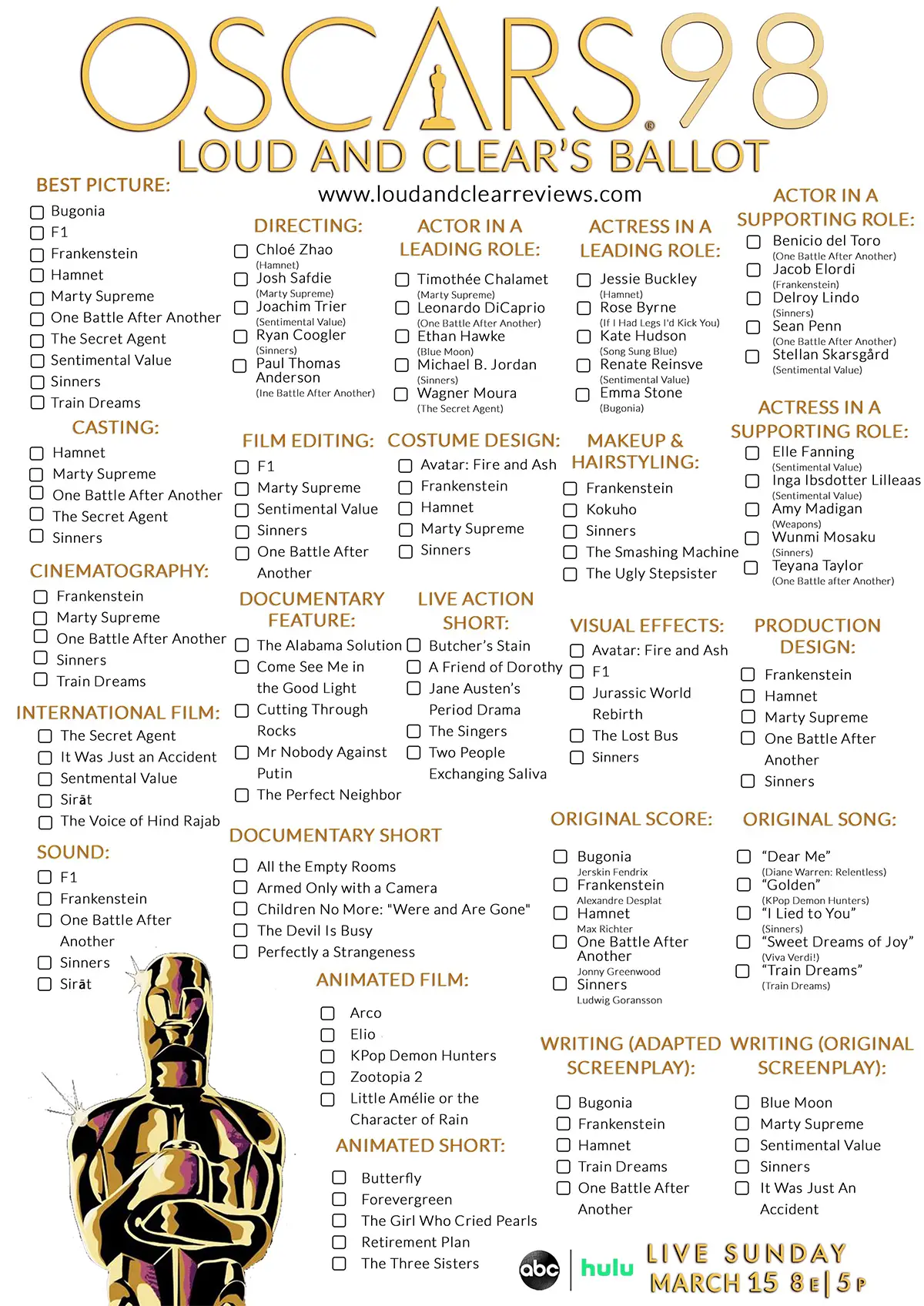 Without further ado, let’s have you guess the Oscars 2026 winners! Keep scrolling for our printable ballot sheet for the 98th Academy Awards.