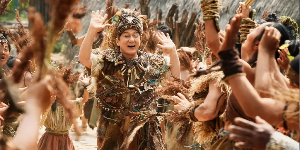 The movie starts with Jackie Chan (playing a fictionalised version of himself) being driven to a “Panda base” in the mountains, accompanied by his friend from the first instalment, Huhu the CGI panda. Suddenly, though, he is transported (somehow) to a magical tribe in the jungle, which, I presume, exists in another dimension or something. In any case, it turns out said tribe idolises pandas, so when they manage to capture both Jackie and Huhu, our human protagonist is immediately informed of a legendary prophecy.