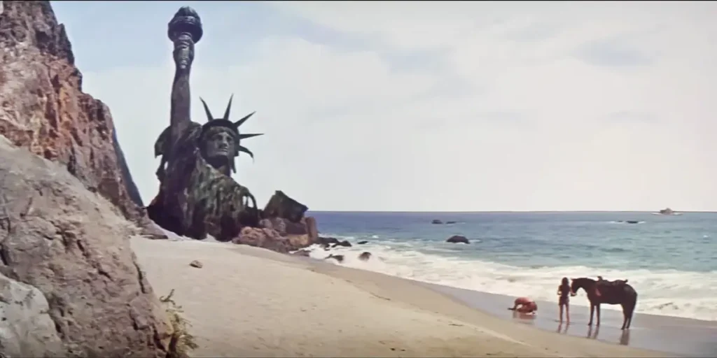 Then the ending turns the whole film back on us. After escaping Ape City, Taylor reaches the shoreline and finds the Statue of Liberty half-buried in the sand. The image answers the question the film has been building toward all along: this is not another planet, but Earth in the far future. The humans did not lose power to apes on some alien world; human civilization destroyed itself, and ape society rose in its place. That is why the ending still lands so hard. It reveals that Taylor has really been looking at the ruins and aftermath of human history, not a bizarre society on a planet far from ours. In that instant, the joke ends.
