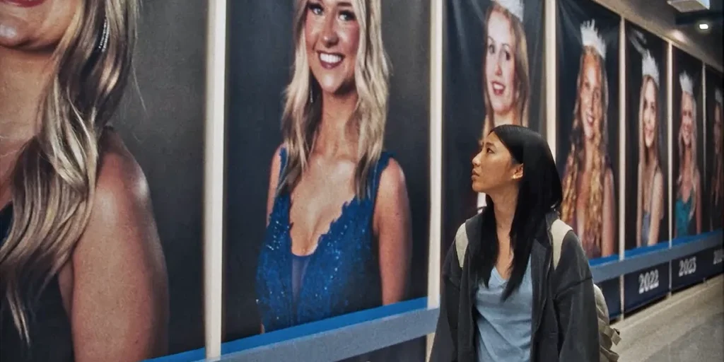 Wang’s decision to cast and write the film with two lead actresses carrying the arc of the same character throughout the film feels ambitious, but Shirley Chen and McKenna Grace perfectly play into one another’s performances to create a Joan/Jo that feels entirely cohesive. Chen expertly crafts the character of Joan, creating a palpable sense of desperation to fit into a community at any cost necessary, even if it means losing her own identity in the process. Grace steps in to play Jo with a similar air of desperation to keep up the ruse and cross this finish line that is being elected prom queen in order to prove erasing herself really was worth it after all.