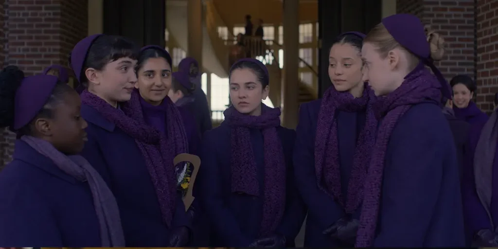 Gilead was hurt by the rebellion, but was not toppled. The school for girls that Aunt Lydia (Ann Dowd, of Mass) founded is still going strong. The older girls in the school are Plums, young women being trained to become wives and mothers as they await their periods. Among this group is Agnes (Chase Infiniti, of One Battle After Another), the daughter of a prominent Commander. Her stepmother, Paula (Amy Seimetz), seems anxious to get her married off, so the wait for the onset of menses, signaling fertility, is a very urgent concern.